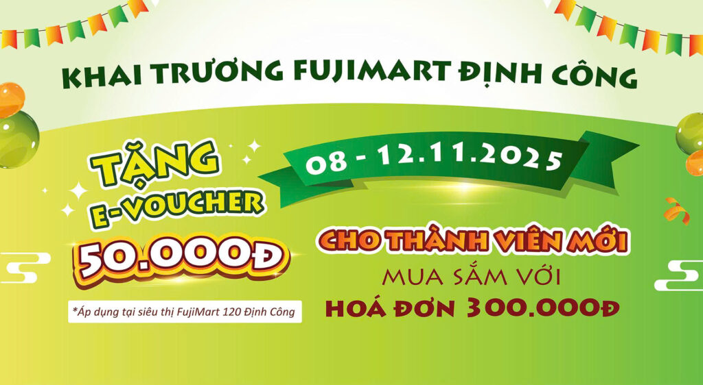 Từ ngày 08/11 đến ngày 12/11/2025, siêu thị FujiMart tặng hàng ngàn E-voucher 50.000 đồng cho thành viên mới nhân dịp khai trương chi nhánh FujiMart tại tòa DC Complex, số 120 Định Công, Hà Nội.