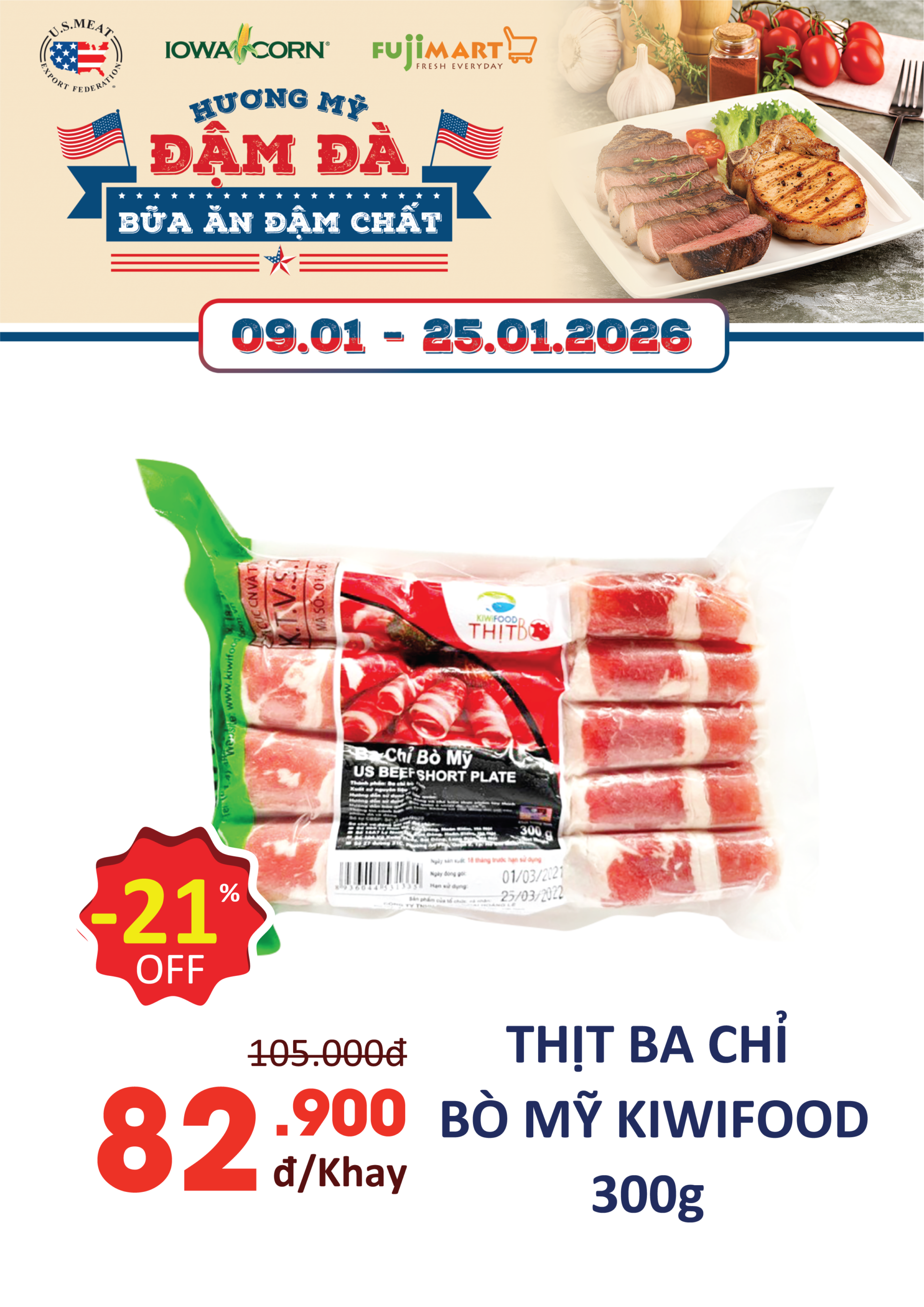 – Trải nghiệm dùng thử thịt nướng trực tiếp tại 13 chi nhánh FujiMart Lê Duẩn, Hoàng Cầu, Tây Sơn, Huỳnh Thúc Kháng, Trần Phú – Hà Đông, 89 Lạc Long Quân, Chính Kinh, Lê Văn Lương, Trung Yên, Lê Đại Hành, Ngọc Khánh, Tân Mai và Times City. Thời gian ăn thử thịt Mỹ chính hiệu là 10h tới 12h, 16h30 tới 18h30 trong các ngày Thứ Bảy, Chủ Nhật từ 09/01 đến 25/01/2026.