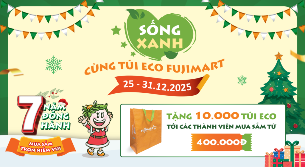 Từ ngày 25/12 đến ngày 31/12/2025, khách hàng thành viên FujiMart tới siêu thị mua sắm; với hóa đơn từ 400.000 đồng trở lên, khách hàng sẽ nhận được nhận 01 Túi Eco FujiMart – Mẫu mới màu cam.