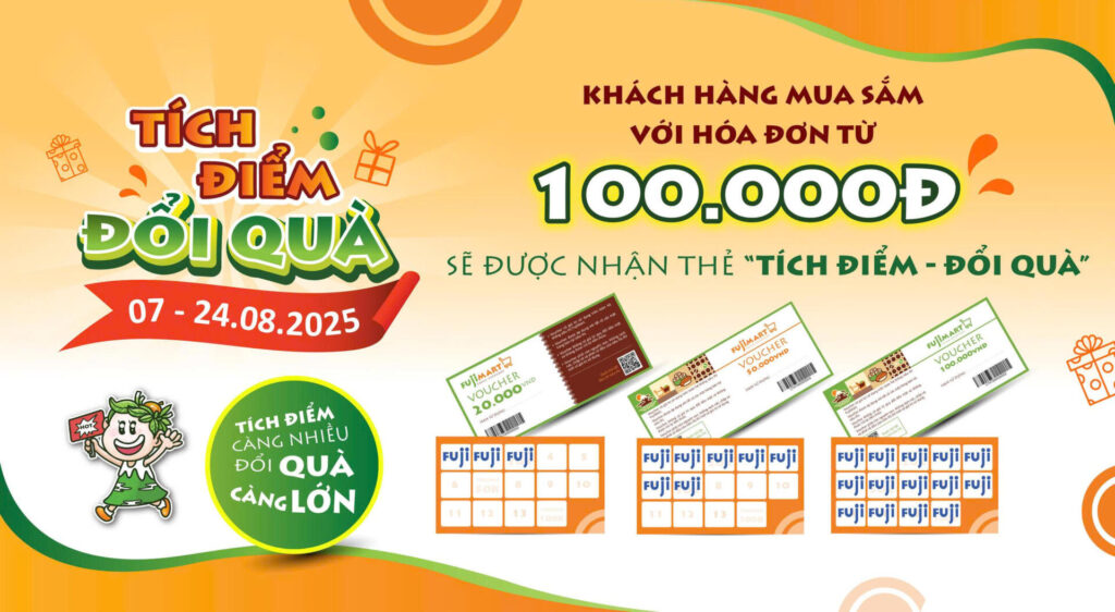 Từ ngày 07 đến 24/08/2025, hệ thống siêu thị FujiMart tổ chức chương trình “Tích điểm đổi quà” với phần thưởng hấp dẫn là VOUCHER trị giá tới 100,000 đồng.